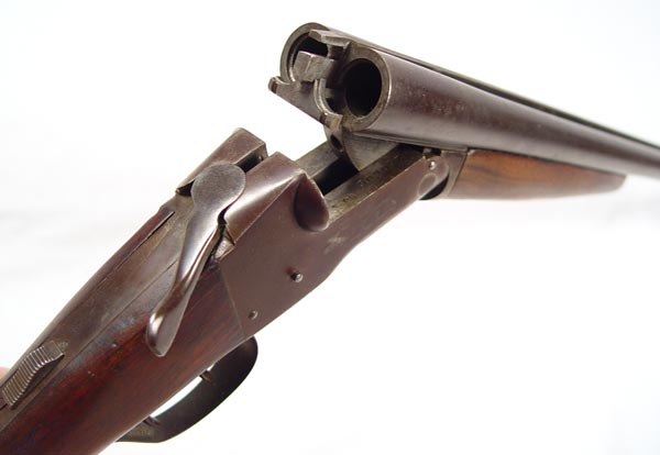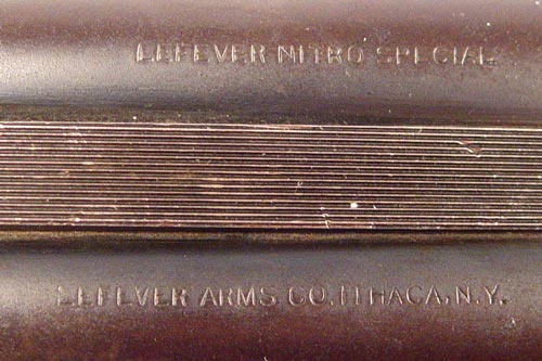 LEFEVER NITRO SPECIAL ENGRAVED DOUBLE BARREL HAMMERLESS SHOTGUN: Marked Lefever Nitro Special, Lefever Arms Co. Ithica NY. Small engraving of goose in flight on either side. Partial checkered stock. Hard rubber butt plate. Dark brown patina. 250xxx serial range. Safety switch.