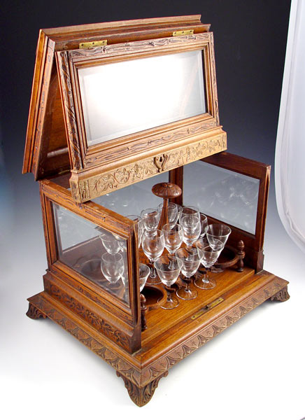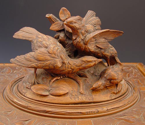 GAME ENHANCED BLACK FOREST CARVED TANTALUS: Carved game birds atop carved tantalus box holding 16 cordial glasses. Beveled glass on all 4 sides. No key. Measures 18 1/2'' high x 16 3/8'' wide x 12 3/4''.