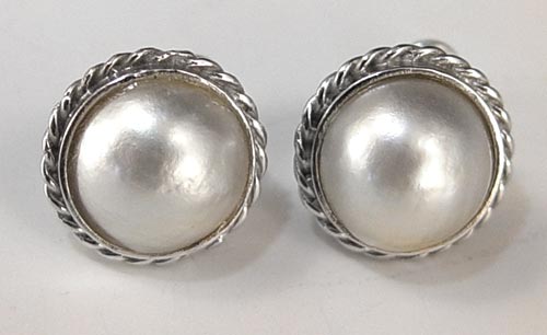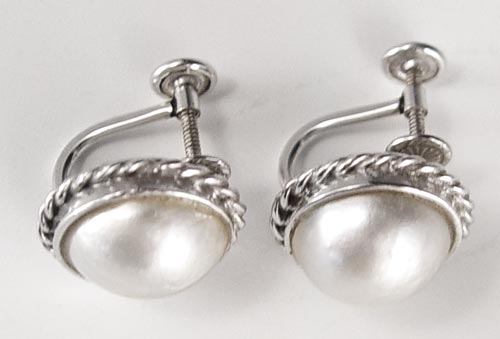 WHITE MABE PEARL EARRINGS: 11.5 mm creamy white Mabe pearls circled in 14 K white gold screw back earrings.