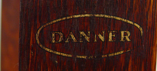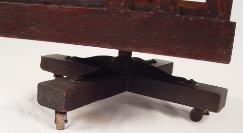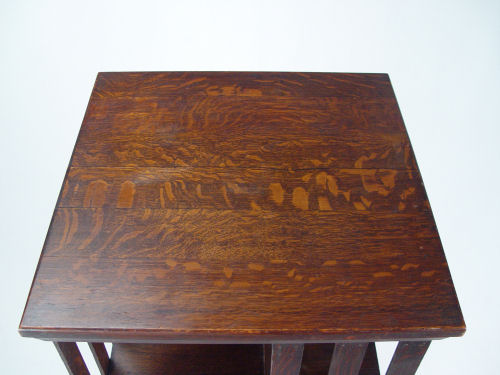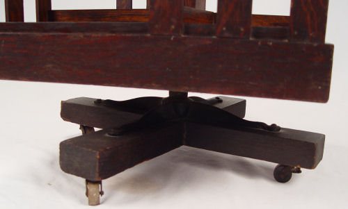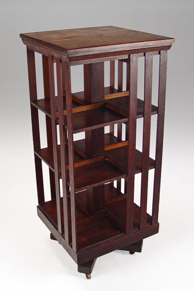 DANNER REVOLVING MISSION OAK BOOKCASE: Late 1800's - early 1900's, Canton Ohio. Open shelving, slat sides. The shelves will accommodate books 10''h, 7'' deep. Rolls on castors. 45 1/2''h. x 20'' square.