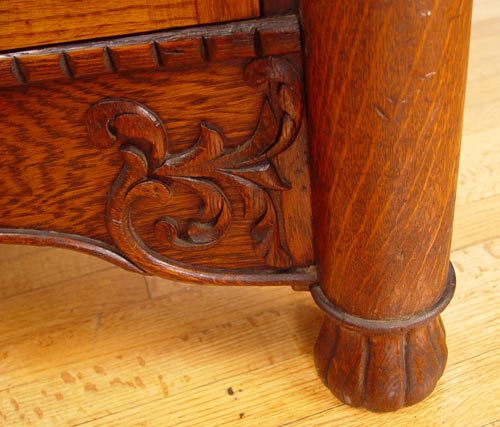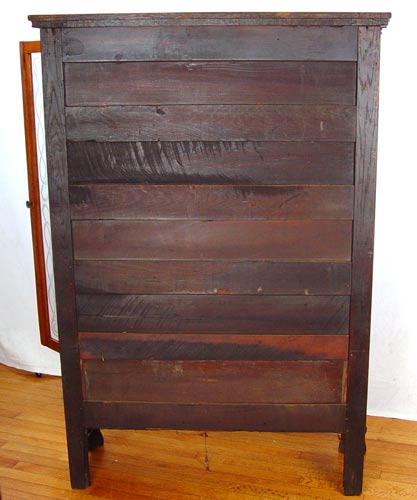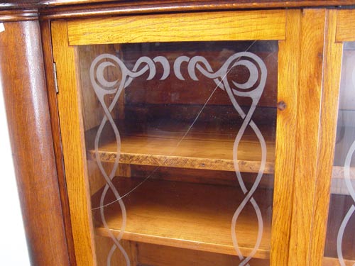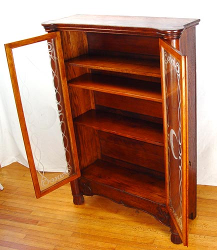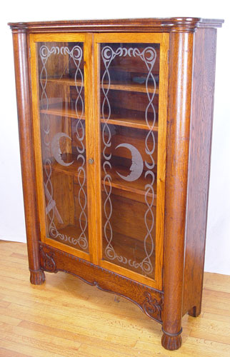 GOLDEN OAK MAN IN THE MOON BOOKCASE: Turn of the century oak double door bookcase. Glass doors are etched in a man in the moon design, please note one glass is cracked. Adjustable interior shelves. Measures 60 1/4'' high x 44'' wide x 14 1/2'' deep.