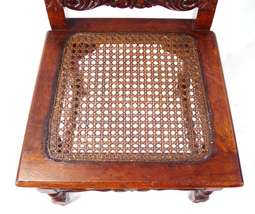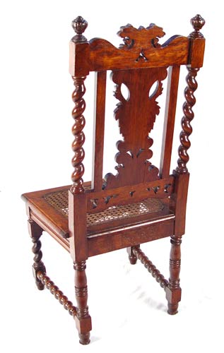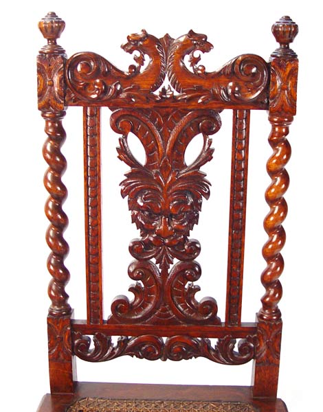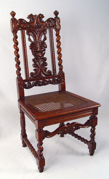 GRIFFIN AND NORTHWIND CARVED OAK SIDE CHAIR: Griffin head top rail, Northwind splat, spiral carved stiles, caned seat. Chair has a gloss finish. 43 1/2'' high x 20'' wide x 18'' deep.