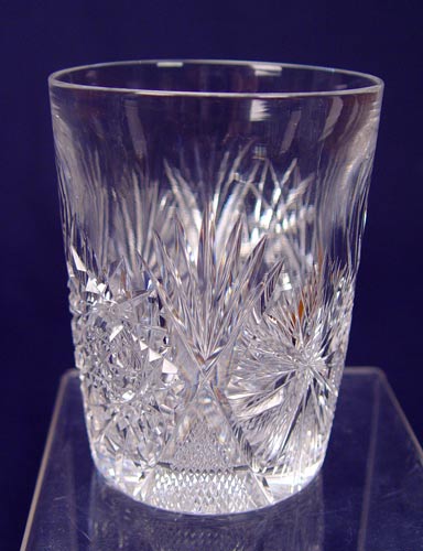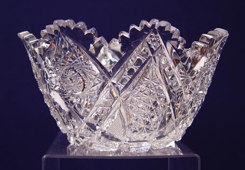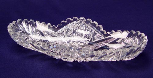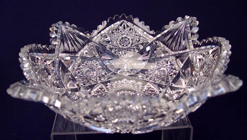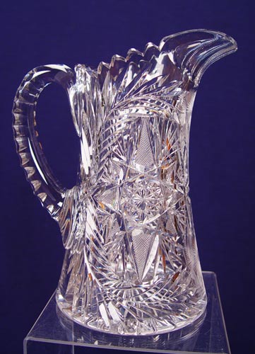 ESTATE AMERICAN BRILLIANT PERIOD CUT GLASS: 10 piece lot to include 1) 8 point bowl, 9 1/2'' dia. 2) 8 point deep bowl, 9 1/2'' dia. 3) Relish tray, 11'' long. 4) 9'' tall water pitcher and 6 tumblers, 4'' high.