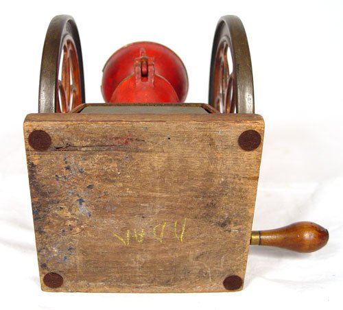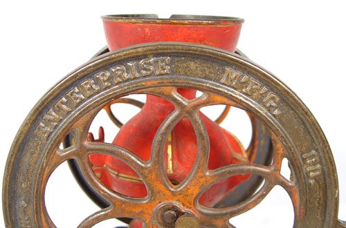 ENTERPRISE #2 COFFEE MILL: Some original paint and decoration remains. 8 3/4'' wheels, 11 1/2'' tall with wood base. Missing lid, chip in top where lid connected, Wheels spin, missing internal works. Replacement drawer. In need of restoration. Marked Enterprise Mfg. Co. Philadelphia USA Pat Oct. 21 '73. Wgt.13 lbs.
