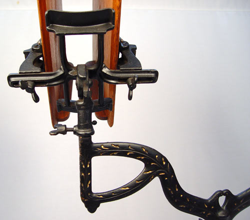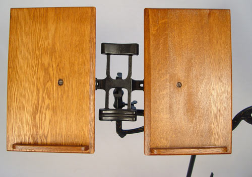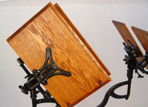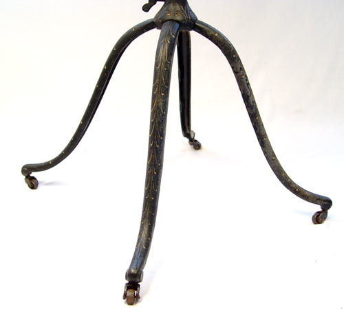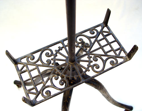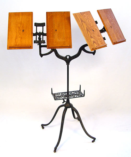 VICTORIAN CAST IRON LIBRARY BOOK STAND: Iron with adjustable oak platforms. Cabriole legs ending in castors. Measures 47'' high x 22'' wide