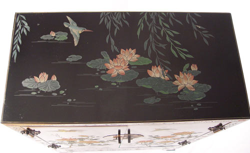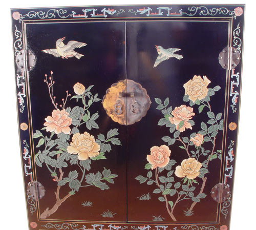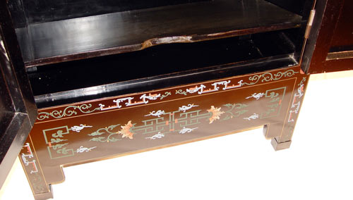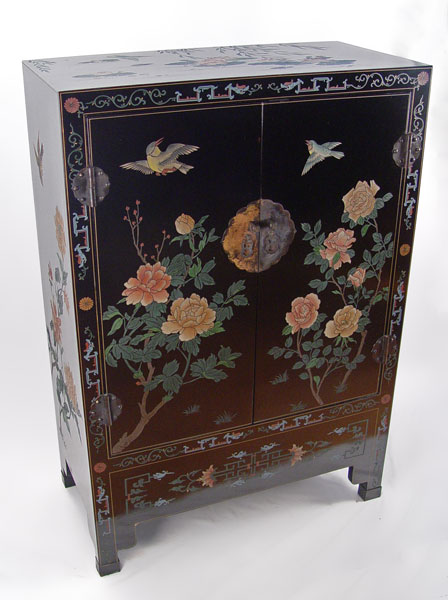 CHINESE LACQUER CABINET: Carved and painted. Measures 50'' high x 34'' wide x 17 1/4'' deep, single interior shelf.
