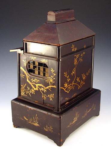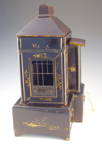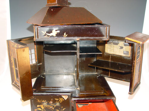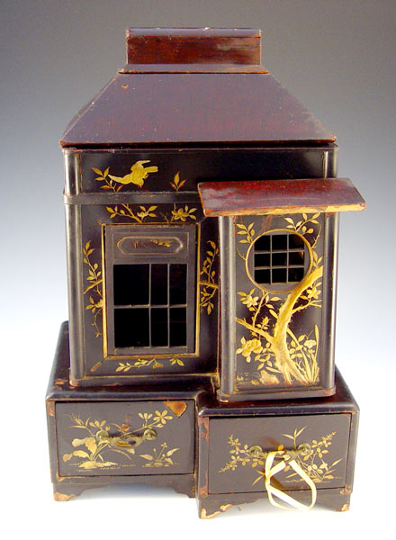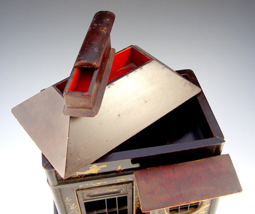 JAPANESE LACQUER INCENSE HOUSE: Gilt painted lacquer. House front unhinges and opens to shelves, 2 drawers at the base, the roof has a small box. Remnants of the thinnest paper windows. 12'' x 9 1/2'' x 8 1/2''.
