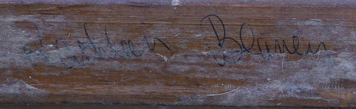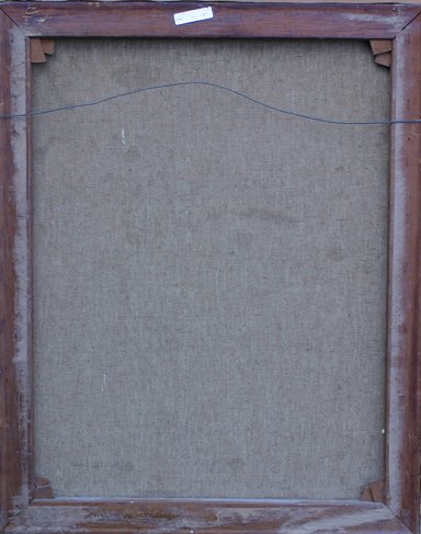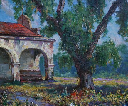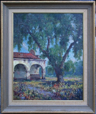 EXCEPTIONAL SAN JUAN CAPISTRANO MISSION SCENE: OIL/C, 25'' x 20'', marked verso Kathleen Blaney?, framed, 31'' x 26'', circa 1940's, pencil inscribed on the stretcher Miss Roth?.