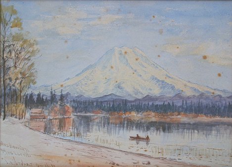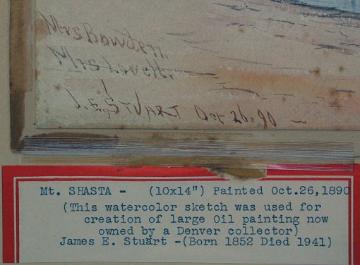 STUART, James Everett, (American 1852-1941): ''Mt. Shasta'', W/C, 9 3/4'' x 13 3/4'', signed and dated Oct. 26th, 1890, scene depicts several figures in a canoe, inscribed lower left Mrs. Bowden, Mrs. Lovell, framed, 21 1/2'' x 23 1/2'', inscription on label under mat reads, ''this watercolor sketch was used for creation of large oil painting now owned by a Denver collector. Glued down, some scattered spots of foxing.