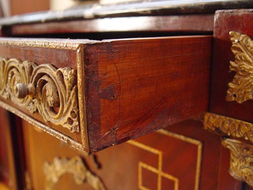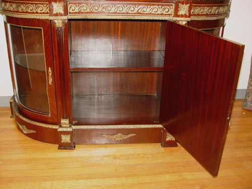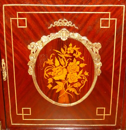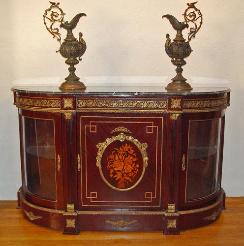 MARBLE TOP FRENCH STYLE SIDE CABINET: Black marble over marquetry and ormolu cabinet. Drawer over single door, flanked by bowed side doors. Glass replaced with plastic. Measures 40'' high x 68'' wide x 21'' deep.