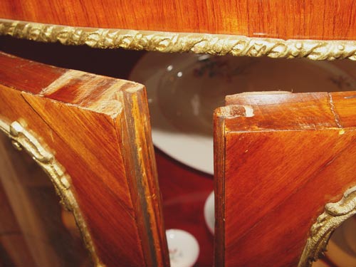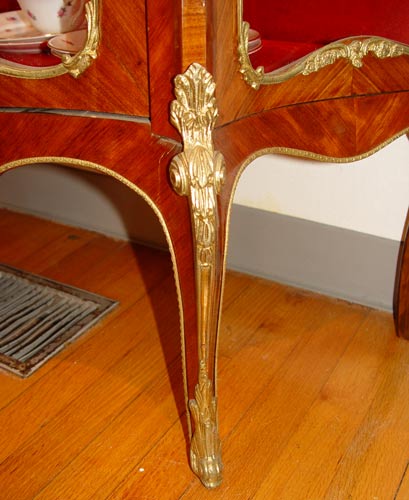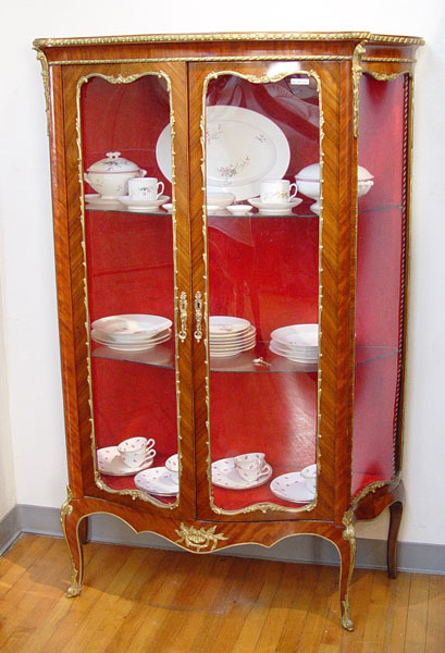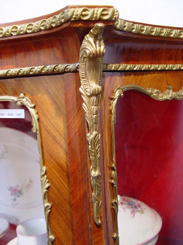 FRENCH STYLE ORMOLU CURIO CABINET: Richly grained veneer cabinet outlined in ormolu. Velvet lined glass shelf interior. Serpentine front and sides. Glass replaced with plastic. Measures 64'' high x 44'' wide x 17'' deep.