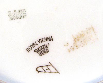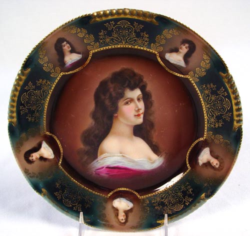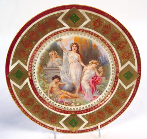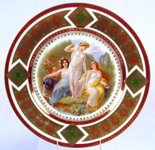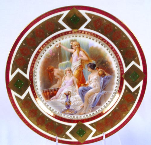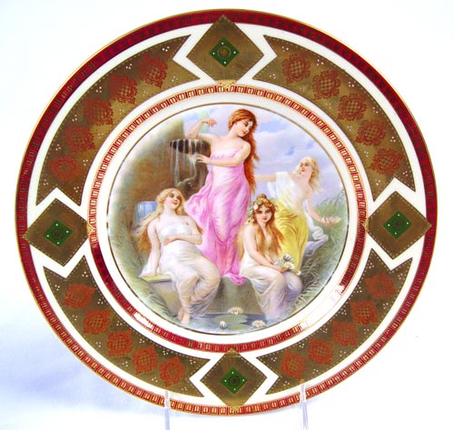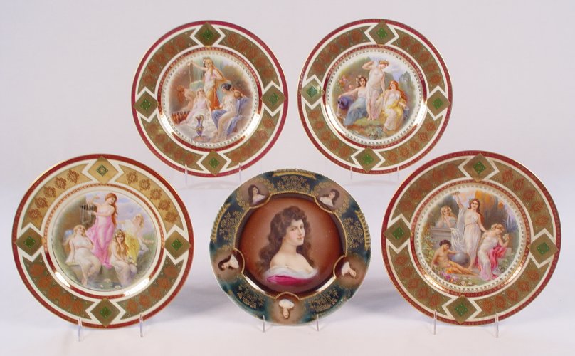 4 PIRKENHAMMER CZECH PORCELAIN CABINET PLATES: Group of 4 plates centering an image of maidens at leisure. Ca. 1918-1938. 10 3/4'' dia. Sold with a Royal Vienna portrait plate, 9 1/2'' dia.