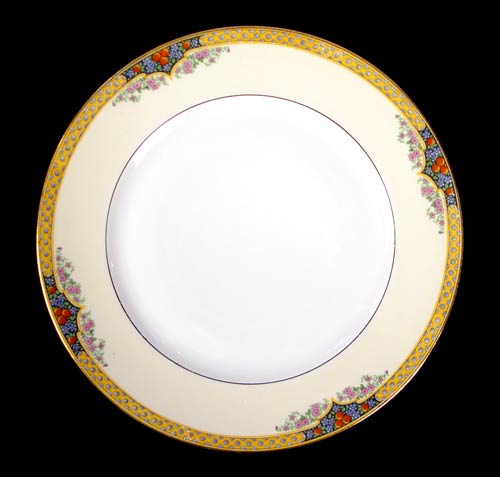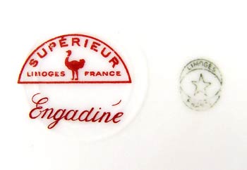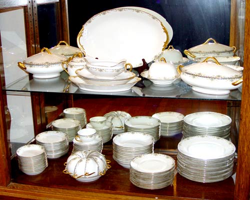 FRENCH LIMOGES FINE CHINA SERVICE: Betoule Legrande & Co, earlier 20th C. 92 pieces to include 12 dinner plates, 11 salad plates, 12 bread plates, 12 soup bowls (1 chip), 12 dessert bowls (1 chip), 11 cups, 12 saucers. Serving pieces are the platter, small platter, relish dish, covered butter, covered oval vegetable, round covered vegetable, gravy dish, open vegetable, cream pitcher and sugar.