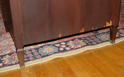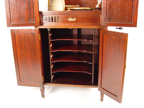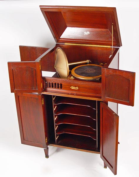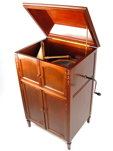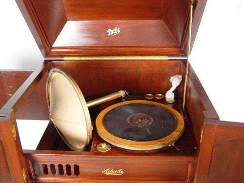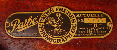 PATHE FRERES ACTUELLE UPRIGHT PHONOGRAPH: In mahogany case. Serial number 5233. Cranks and platter spins. Original finish. Measures 42'' high x 24 1/2'' wide x 19 3/4'' deep. Please note chips to veneer on bottom back edge.