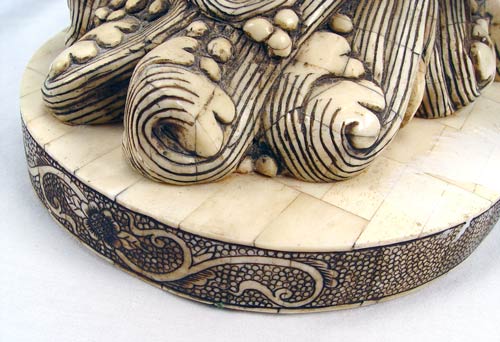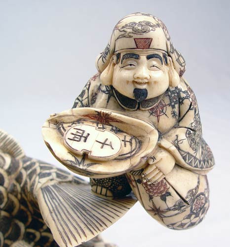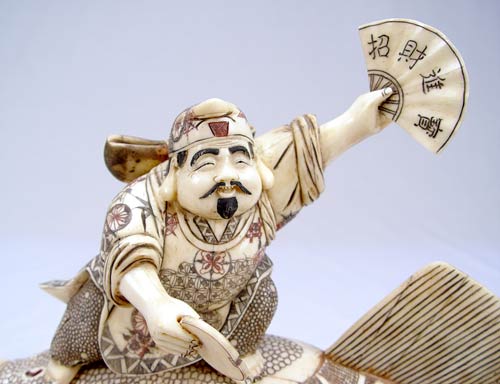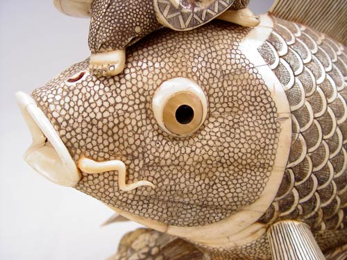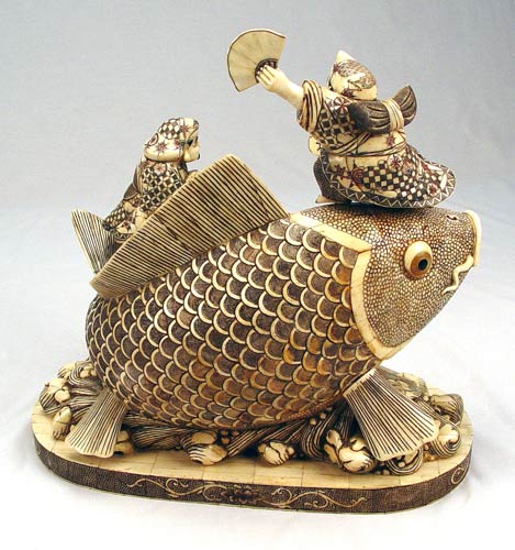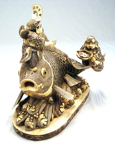LARGE CHINESE BONE SCULPTURE OF FISH: 2 men riding a large fish. Bone clad sculpture, 19''h. x 20'' long.