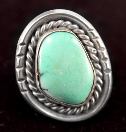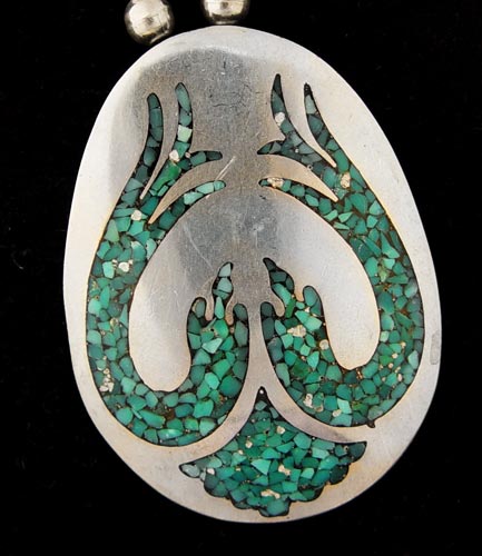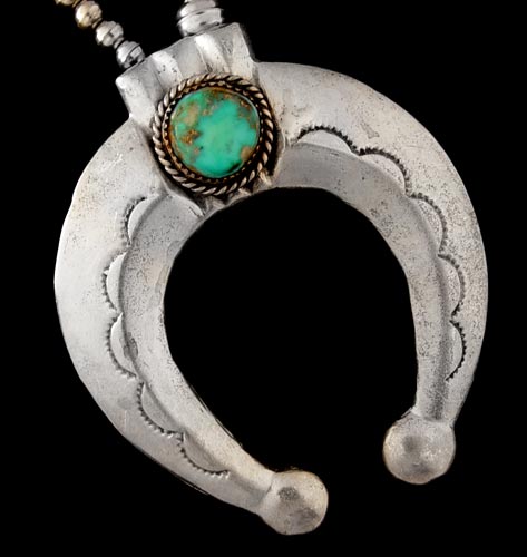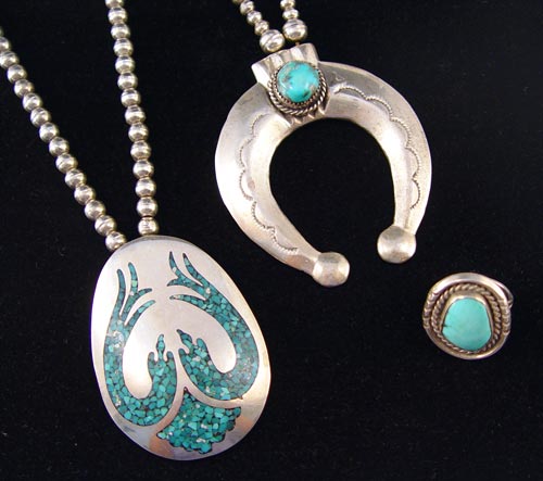 3 PIECE NATIVE AMERICAN SILVER AND TURQUOISE JEWELRY: 1) Crescent shaped pendant with one turquoise. The stone is approx. 13mm., the pendant is 2 1/2'' dia. Artist signed, hangs from a beaded chain. 2) Turquoise inlaid silver pendant on beaded chain, pendant is 2 1/2'' long. 3) Turquoise and silver ring, size 6.