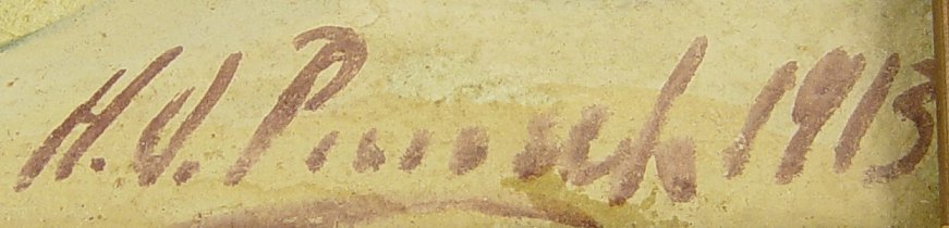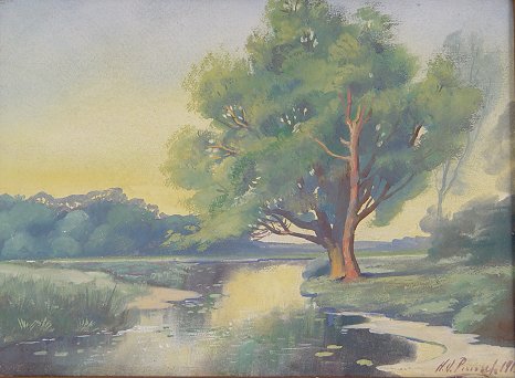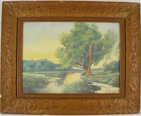PUNSCH, Henry D., (American, 1868-1944): Meandering Stream, W/C & Gouache, 10 1/2'' x 14 1/2'' sight size, signed and dated 1913, period Arts and Crafts gilded gesso foliate motif frame with minor wear, 17'' x 20 3/4''. Small hole in right margin.