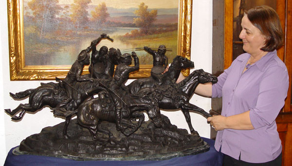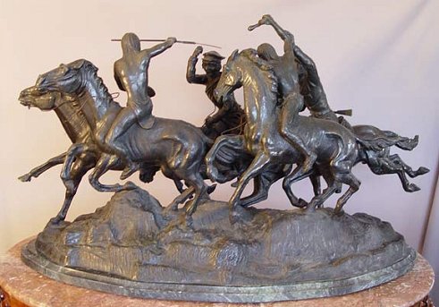 ''OLD DRAGOONS'' MASSIVE REMINGTON REPLICATION BRONZE: 24'' h. x 45'' w. w/marble plinth. One of the figures is missing (broken) his weapon.