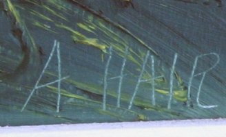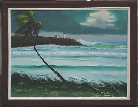 Large Coastal Florida Highwaymen Landscape with Lighthouse, OIL/Masonite, 30'' x 40'', signed A. Hair, framed, 36'' x 46''. Although the style resembles a Hair, the signature does not match the examples I have seen.