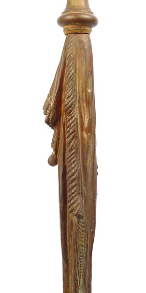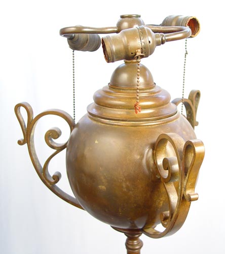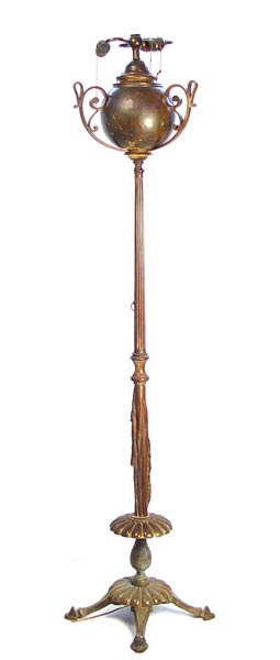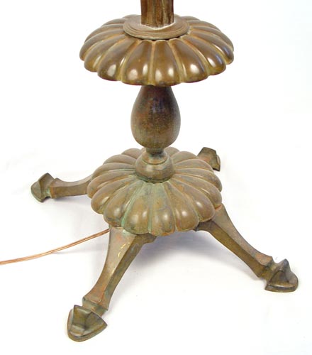 BRONZE FLOOR LAMP: Draped design pole on a base of 4 hoof feet, 3 sockets, 65''h. The floor lamps in this collection may be incomplete and may be built from components, including some signed Tiffany.