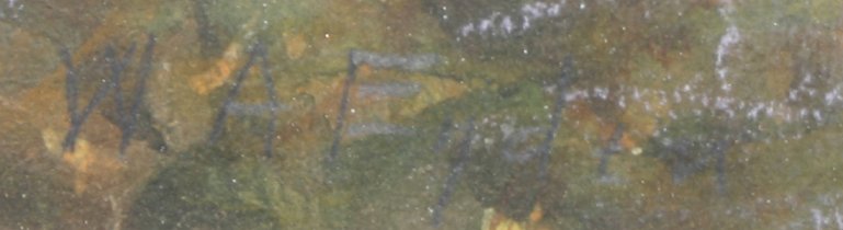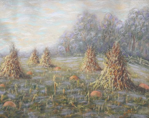 EYDEN, W.A., (American, 1859-1919): ''Cornshocks and Pumpkins,'' Gouache, 15 1/2'' x 19 1/2'' sight size, pencil signed and framed, 24'' x 27''.