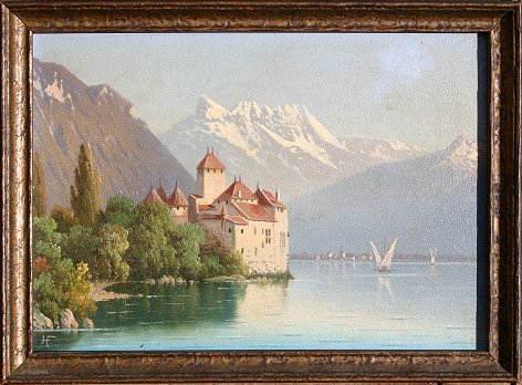 EXCEPTIONAL INTERLAKEN MINIATURE OIL/B: 6'' x 8'', monogrammed, circa 1920.