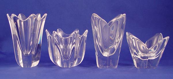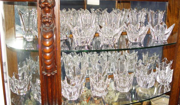 24 ORREFORS SWEDISH CRYSTAL CANDLE HOLDERS: Three styles. There are 8 of the tallest, 5 3/4. There are 10 middle, 4'', and 5 of the shorter, 3 5/8''.