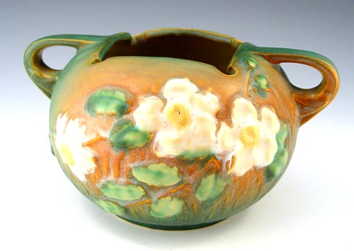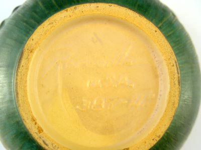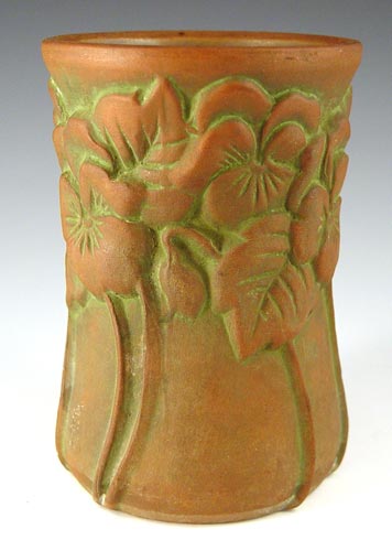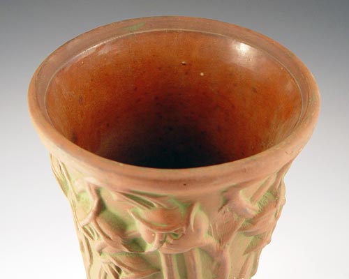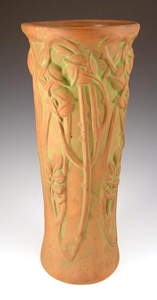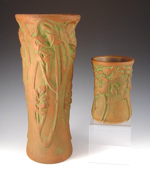 2 PETERS & REED AZTEC MOSS POTTERY VASES: 14 1/4'' tall and 6'' tall. Unsigned.