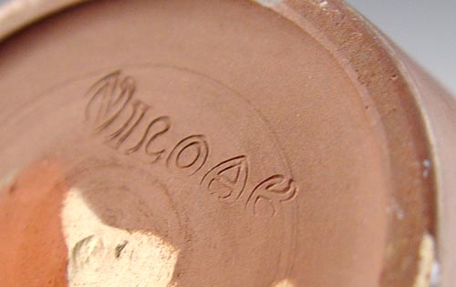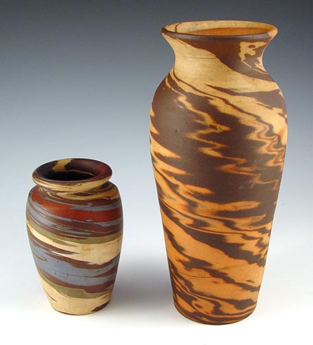 2 NILOAK ARTS AND CRAFTS ART POTTERY VASES: The shorter of the two with blue swirls is 5 1/4'' dia, and is signed. The taller is not signed, 10''h.