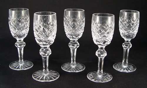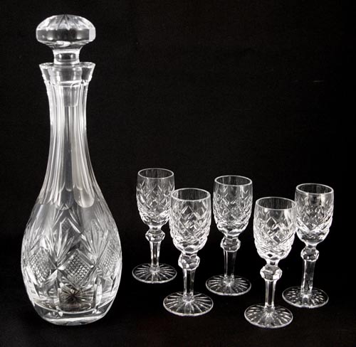 WATERFORD DECANTER AND CORDIALS: 5 cordials are in the Powerscourt pattern. The decanter is signed Waterford in unidentified pattern, 11''h.