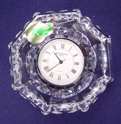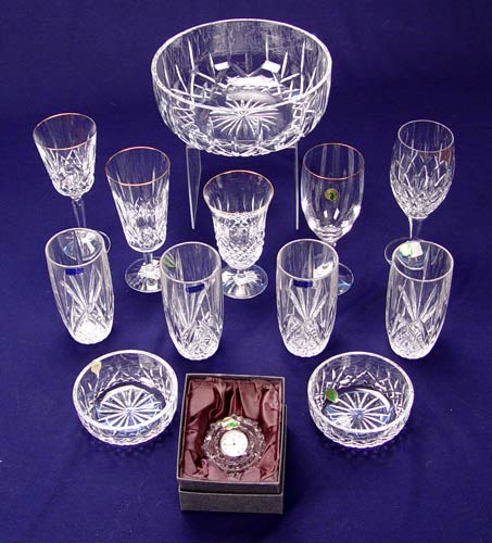 ASSORTED WATERFORD CRYSTAL LOT WITH ORIGINAL BOXES: To include 1) Golden Castlemain iced tea 6 1/2'' high. 2) Pair Lismore small party bowls 5'' dia. 3) Golden Lismore tall goblet 8 3/8'' high. 4) Golden Lismore tall iced tea 7 7/8'' high. 5) Carleton Gold ice tea 8 1/4'' high. 6) Lismore large bowl 4'' high x 10'' dia. (no box). 7) Marquis by Waterford iced tea 8 1/2'' high. 8) Set of 4 Marquis by Waterford Brookside hiball 6'' high. 9) Desk clock 2 3/8'' high. No chips or cracks to any.