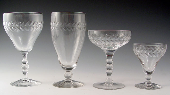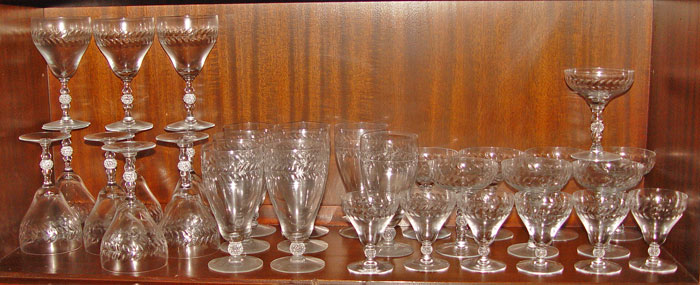 DUNCAN & MILLER LAUREL WREATH STEMWARE: 32 pieces to include 10 water goblets, 8 iced tea, 8 champagne/tall sherberts, and 6 cordials.