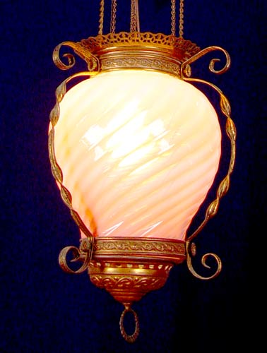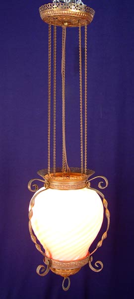 CRANBERRY OPALESCENT SWIRL GLASS VICTORIAN HANGING LAMP: Electrified with no harm done to shade. The shade has a 4'' upper rim. Metal finish is worn.