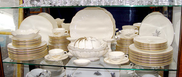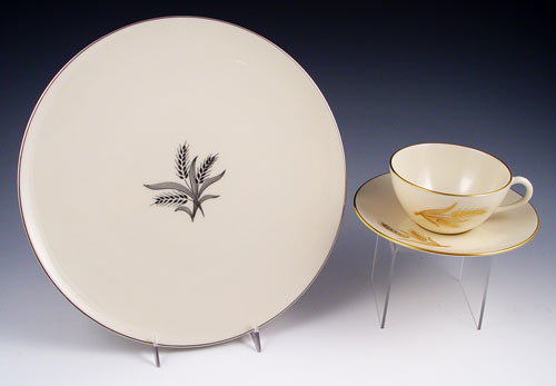 LENOX FINE CHINA - 2 SETS: Platinum trim ''Symphony'' and gold trim ''Wheat''. The 31 pieces of Symphony include 8 dinner plates, 6 salad plates, 6 bread plates, vegetable bowl, 6 saucers and 4 cups. The 61 pieces in the Wheat pattern includes 14 dinner plates, 8 salad plates, 16 bread plates, 10 cups and 12 saucers. These sets are sold with miscellaneous pieces- a 12 3/4'' round gold rim platter, a pair of platinum rim candle sticks, 4 1/2'', a vegetable serving bowl, and a 7'' serving bowl.