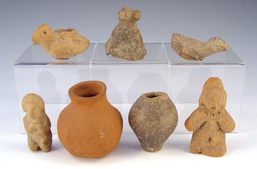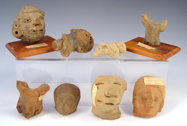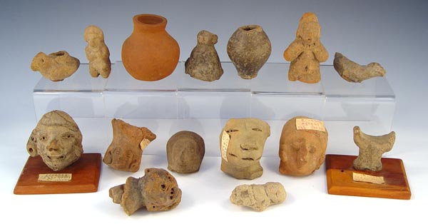 PRECOLUMBIAN ECUADORIAN CARVINGS: Assorted artifacts including dogs head, faces, idols and jars. Several labeled with areas of Ecuador where found. 15 pieces
