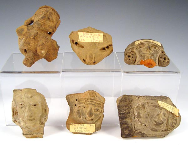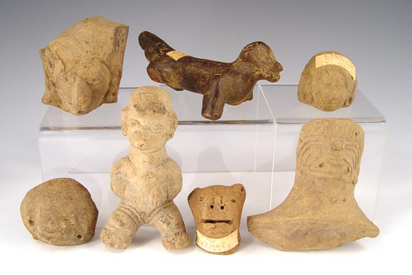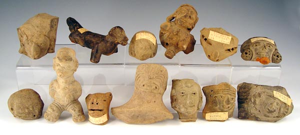PRECOLUMBIAN ECUADORIAN CARVINGS: Assorted artifacts including dog, faces, idols. Several labeled with areas of Ecuador where found. 13 pieces