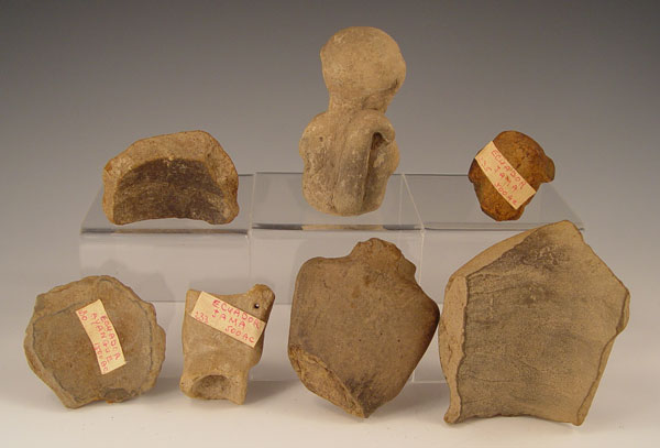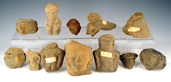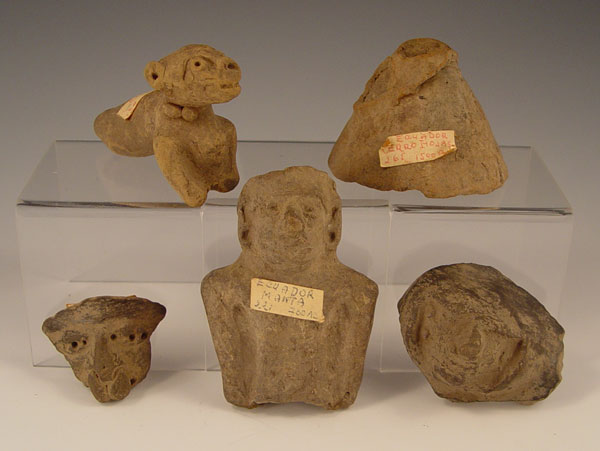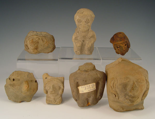 PRECOLUMBIAN ECUADORIAN CARVINGS: Assorted artifacts including dogs, faces, idols and jars piece. Several labeled with areas of Ecuador where found. 12 pieces