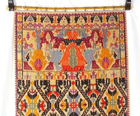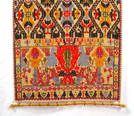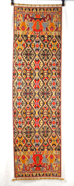 SLAVIC EMBROIDERED TAPESTRY: Heavy thread or yarn with bits of metallic threads on linen, showing border of black birds and crowned eagles. Measures 78'' long x 22'' wide.