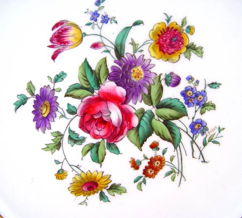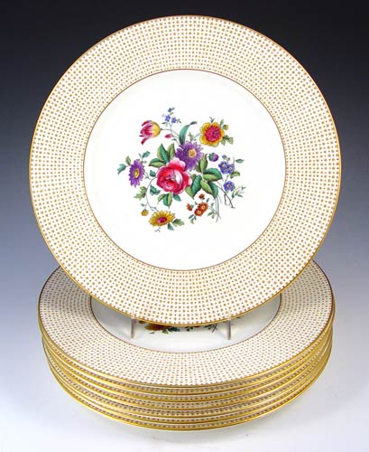 SET OF 8 CAULDON FINE CHINA SERVICE PLATES: Centering enamel floral decoration, 10 1/2'' dia.
