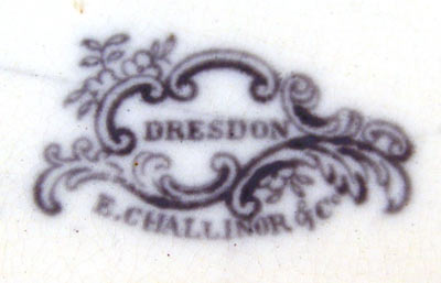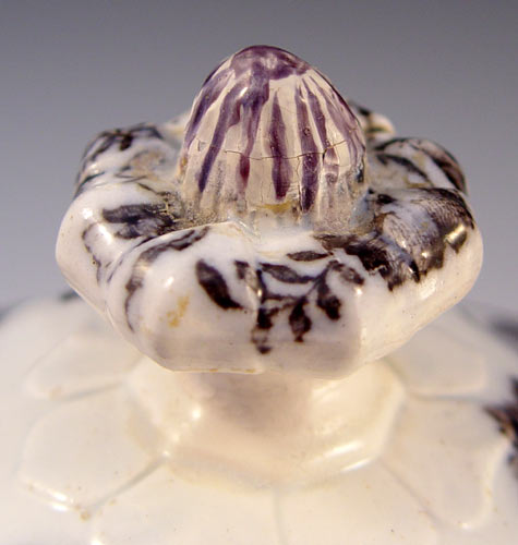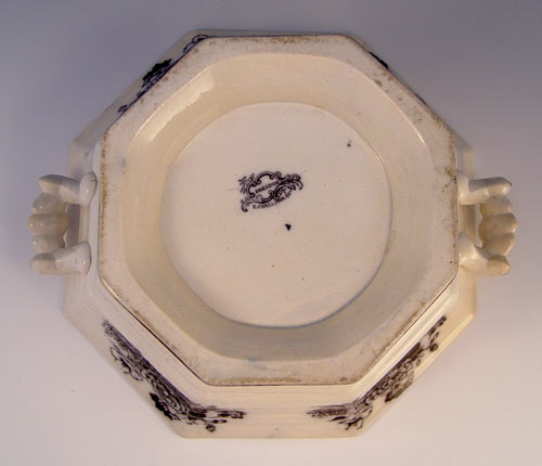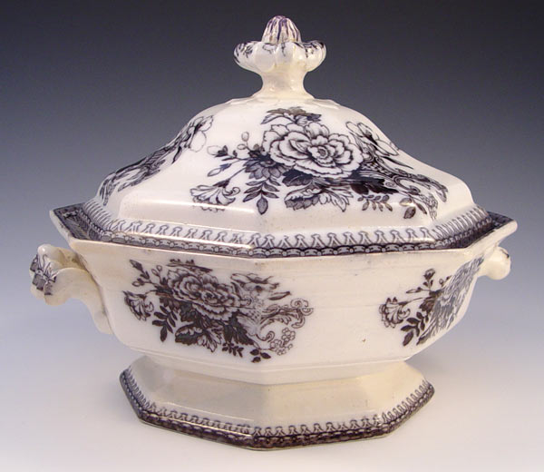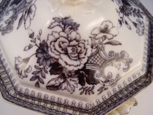 STAFFORDSHIRE BLACK TRANSFERWARE COVERED VEGETABLE DISH: Dresden by E. Challinor, Ca. 1853-1867. Octagonal form with side handles. 9''h. x 10'' dia. Please note old restoration to lid finial.