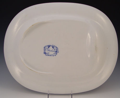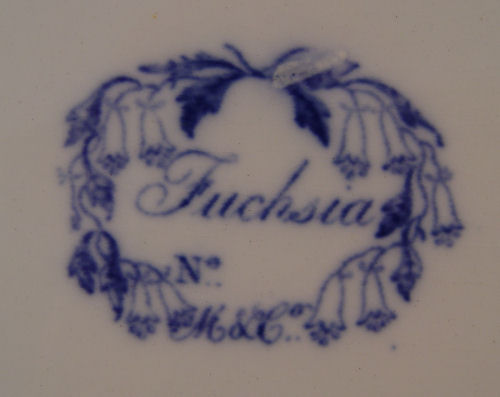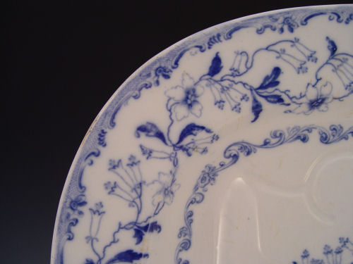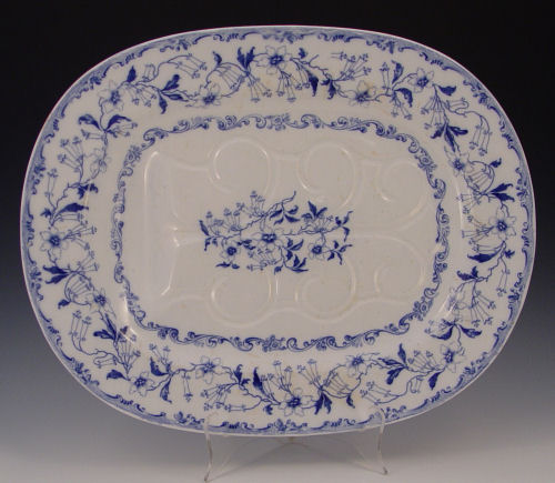 STAFFORDSHIRE FLOW BLUE MEAT PLATTER: Impressed ''New Stone''. M & Co blue under glaze, attributed to C.J. Mason & Co.. The pattern is Fuchsia. 18 3/4 x 15''.