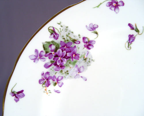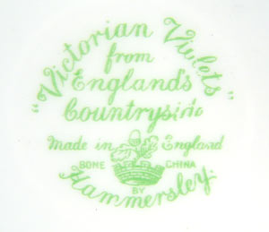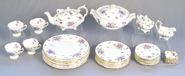 ''VICTORIAN VIOLET'' FINE CHINA BY HAMMERSLEY: 32 pieces to include teapot, covered vegetable, cream pitcher, covered sugar, 8 dinner plates, 8 salad plates, 4 cups, 8 saucers. Plus 6 individual James Kent violet design nut dishes.