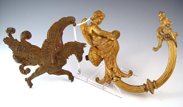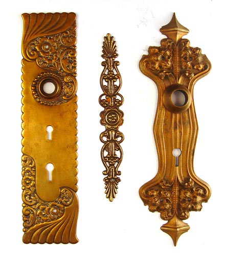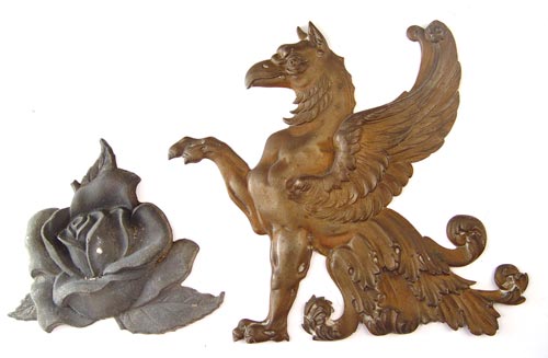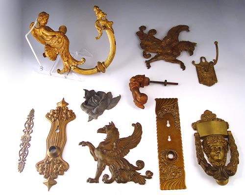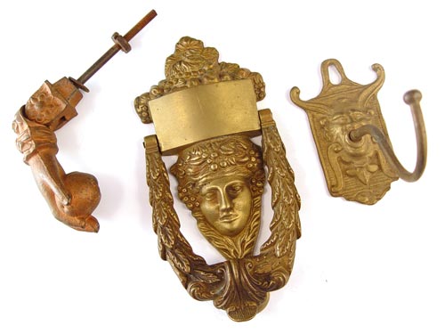 LOT VINTAGE ARCHITECTURAL DOOR KNOCKERS, PLAQUES: To include 1) ''Anna Livia'' style cast door knocker marked Portugal, 8'' high. 2) Hand with ball style cast door knocker, marked CF with anchor, 4 3/4'' high. 3) Brass finger plate with 2 keyholes, floral and scroll design, 9 7/8'' high. 4) Cast fingerplate 10 1/4'' high. 5) Pair reverse image griffin cast wall plaques 6 3/8'' high x 6 1/8'' wide. 6) Rose cast wall plaque 4'' high x 4 1/2'' wide. 7) Cast cherub wall bracket 9'' high x 8 5/8''. 8) Small cast wall hook with face 4 1/4'' high x 5 1/8'' deep.