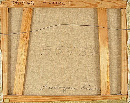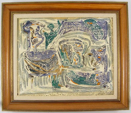 ABSTRACT OIL/C ILLEGIBLY SIGNED SOLAL?: 16'' x 19 3/4'', framed, 21'' x 25''. Some sporadic paint flecking.