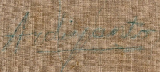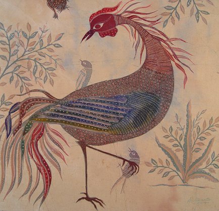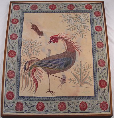 BATIK OF CAT STALKING HEN WITH CHICKS, SIGNED ARDIZANTO: 44 1/2'' x 37'', framed, 46'' x 39''. Some staining and fading, sold as is.