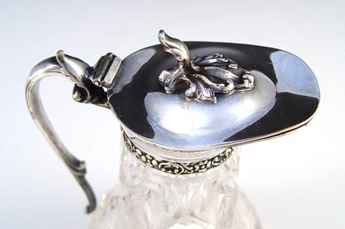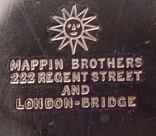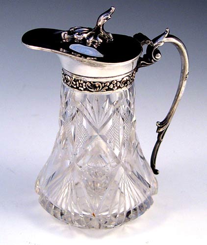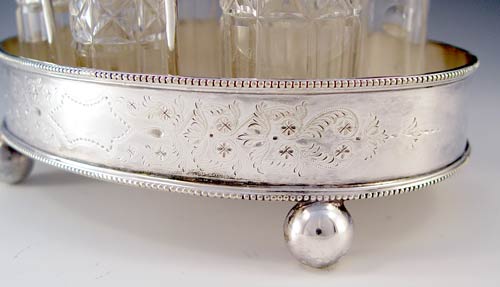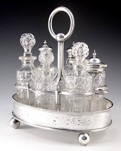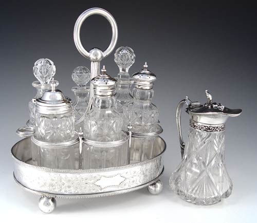 MAPPIN BROS. SILVER PLATE CASTOR SET: Silver plate stand with 6 matching bottles. The stand in brilliant cut and rests on ball feet. 9 1/2''h. x 8''. Sold with a silver plate mounted Brilliant cut glass syrup pitcher, 5''h.