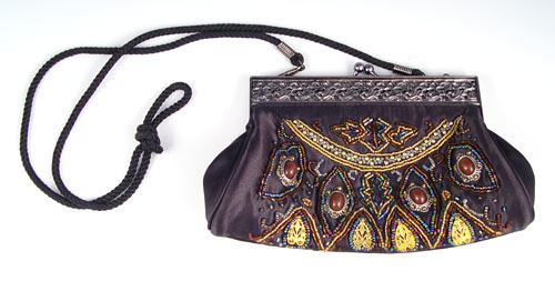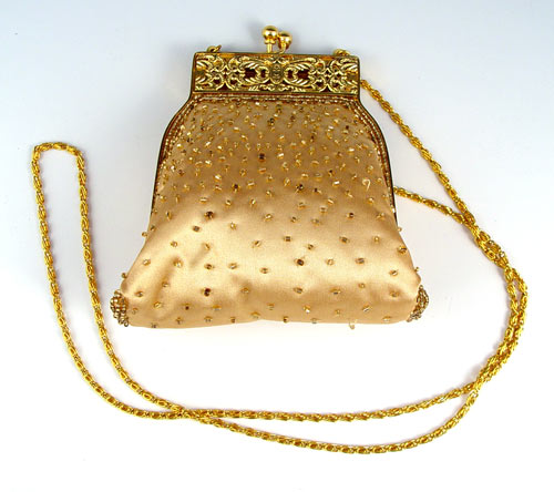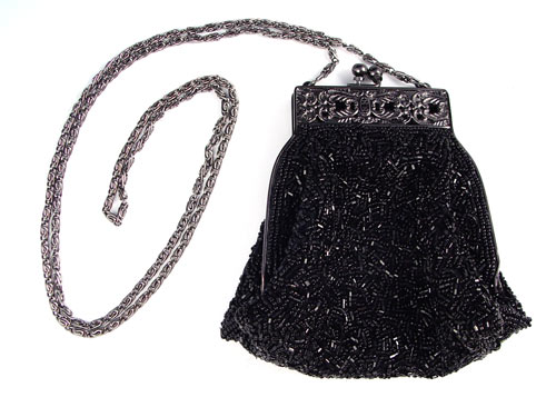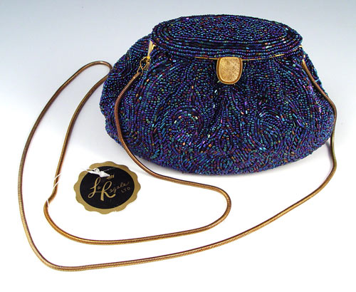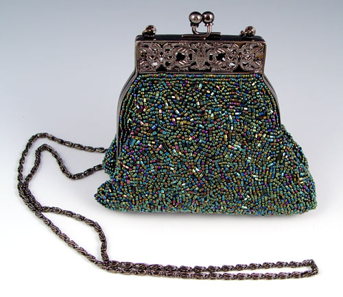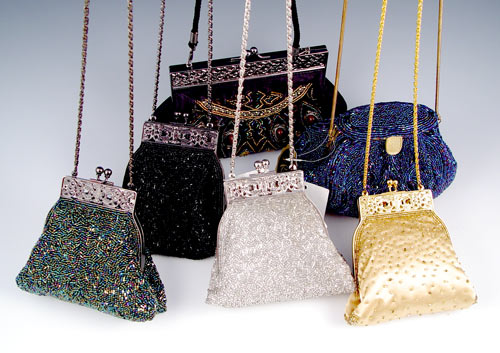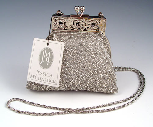 LOT OF 6 BEADED EVENING PURSES: All are in new condition, 2 with tags. La Regale iridescent blue beads new with tag. Jessica McClintock silver glass beads, new with tag. Sold with 3 bags by Mariell and a black Jessica McClintock.