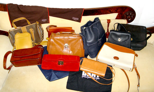 A DOZEN FINE LEATHER PURSES: To include 4 Coach ( navy, yellow, red & brown), a Brahman, an El Portal, Fendi, Dooney & Burke, Fossil, and 2 with Dillards Labels. All like new.