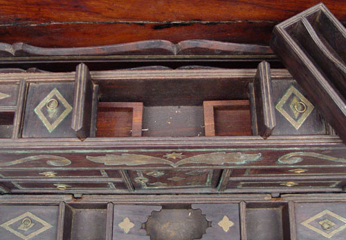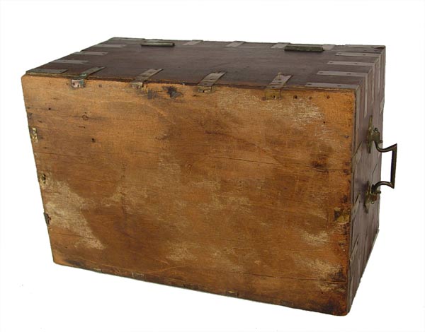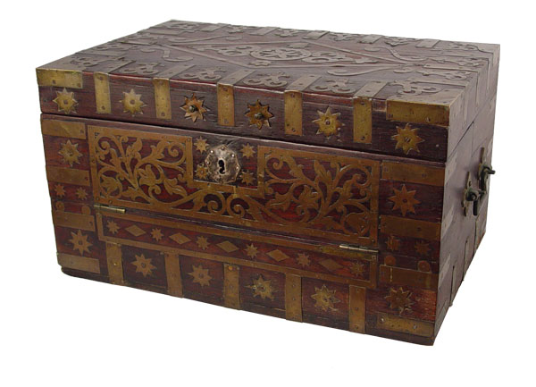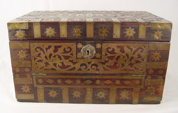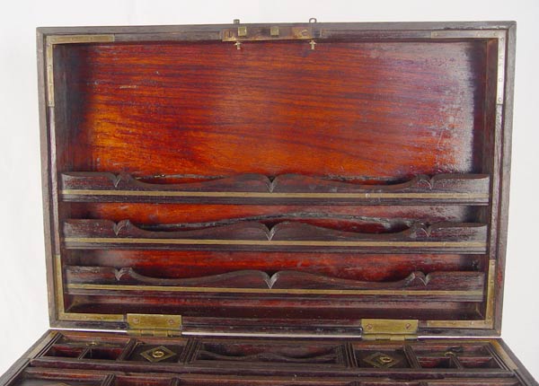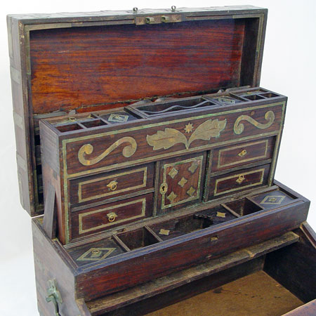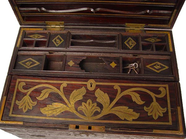 BRASS INLAY TRIPLE TRAVEL CAPTAINS DESK BOX: Decorated and cornered with brass strap work over wood. With pop-ups and several hidden spaces. Folding writing slope has open compartment underneath. Red velvet lining in need of repair. Heavy brass handles. Measures 12 1/4'' high x 21 3/4'' x 14 1/4''.
