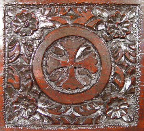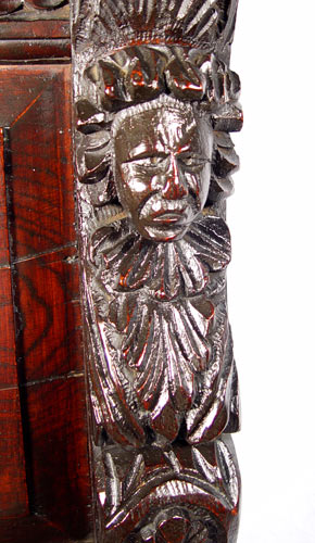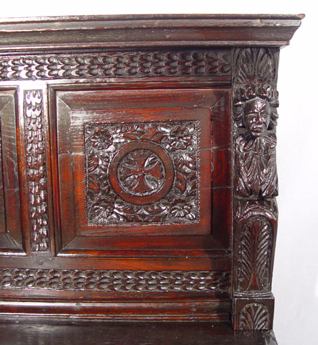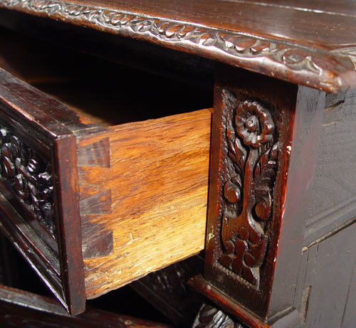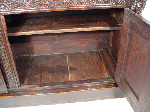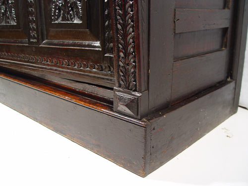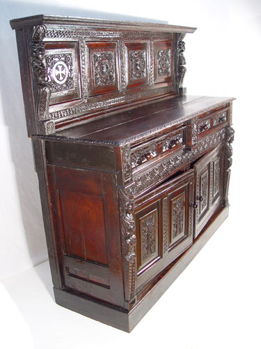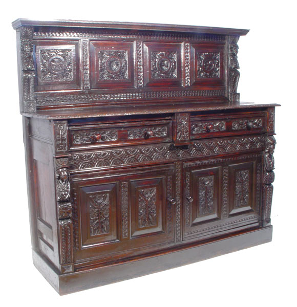 JACOBEAN FLEMISH OR DUTCH CARVED OAK HEAVILY CARVED CUPBOARD: Chamfered and dovetail construction. Paneled sides and backboard. 56 1/8'' high x 61 1/2'' wide x 20'' deep